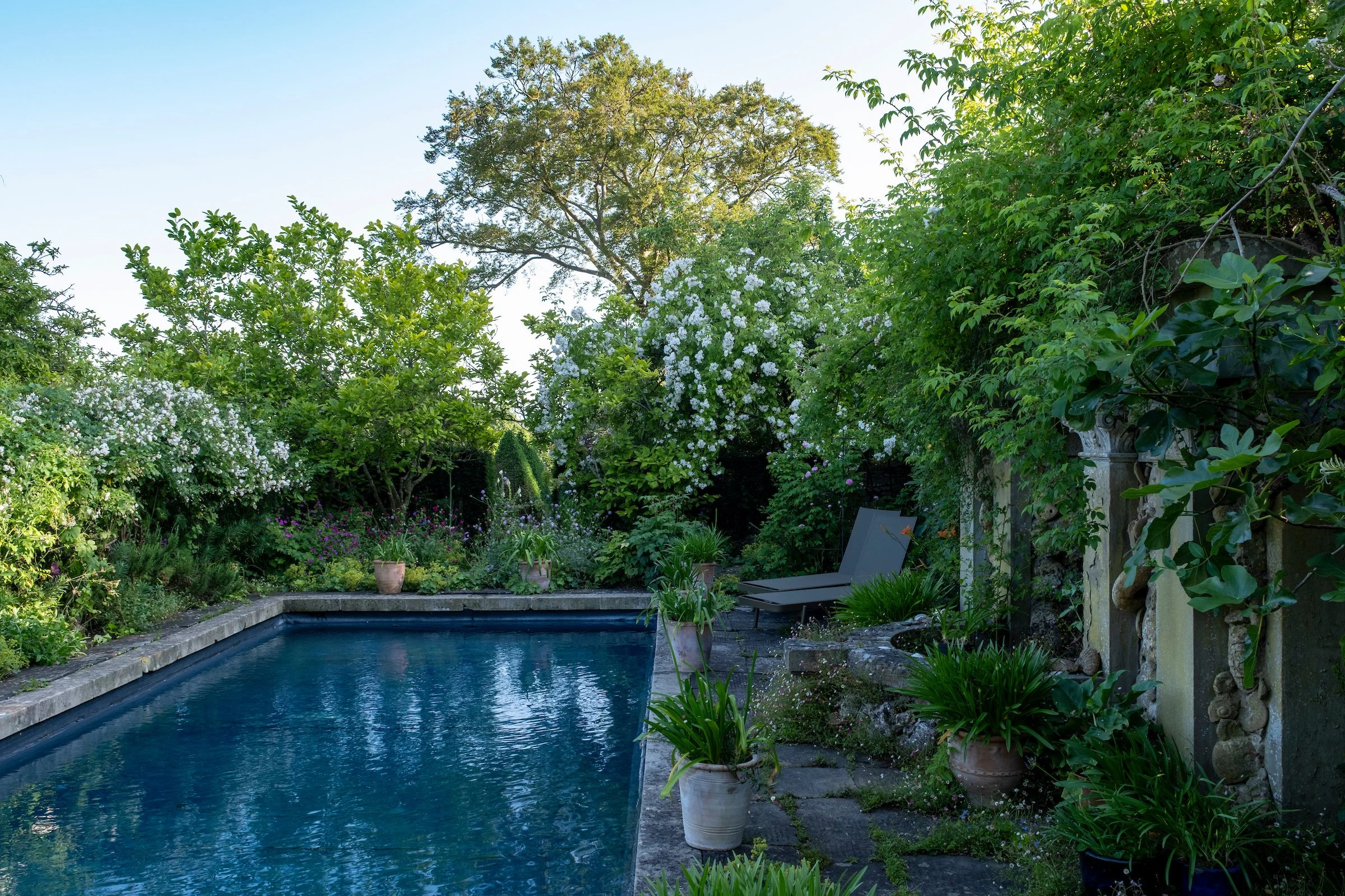 On the outer wall of the Rose garden, sits a stone water trough and fountain bringing a delicate freshness to the air. This overlooked by an enchanting wooden treehouse, mostly hidden from view by a large yew tree, which discreetly marks the entrance to the Rose Garden from the Chapel Border walk.