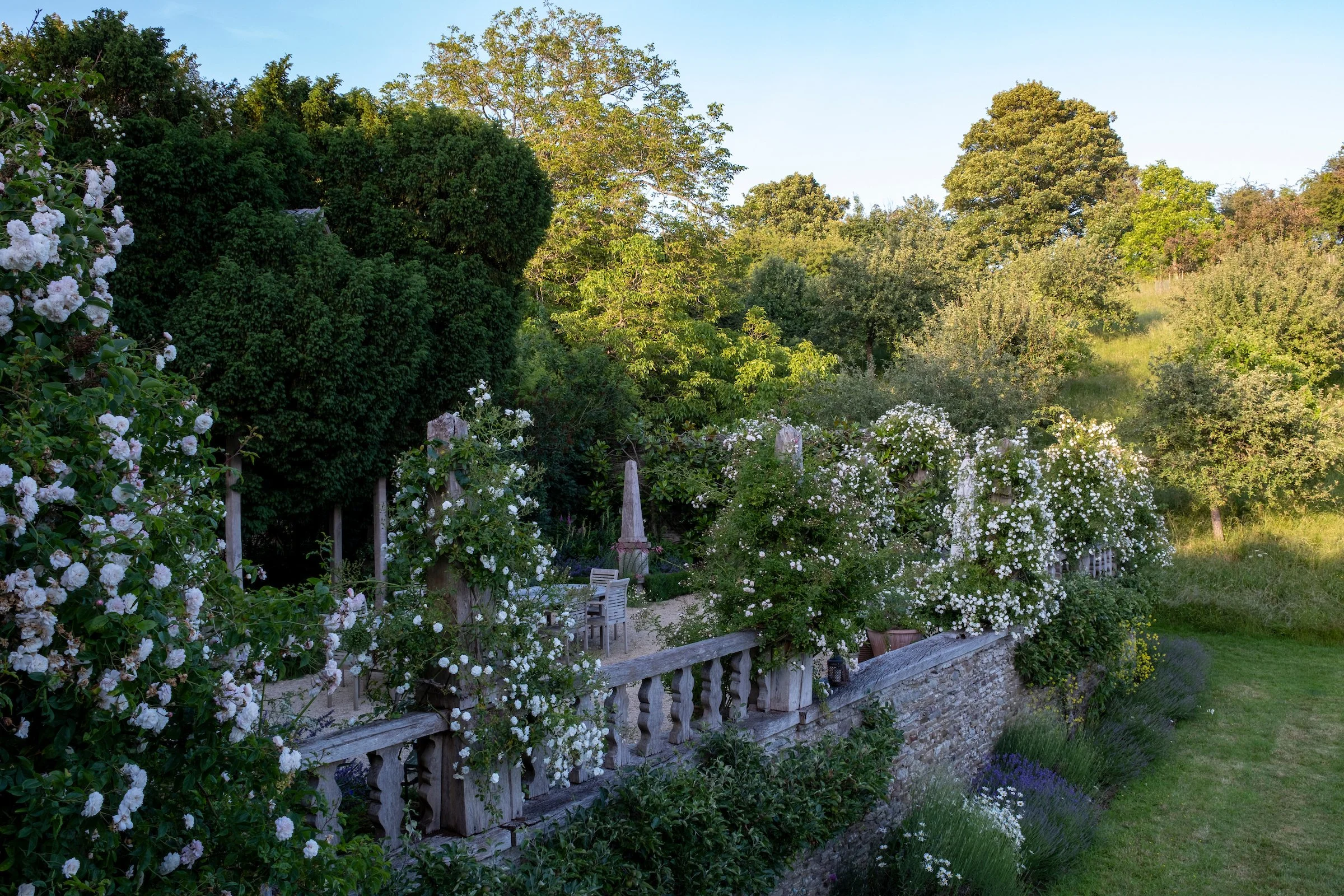 Situated within the Formal Gardens, the Rose Garden offers breath-taking views across the Orchard, Wild Flower Meadow and beyond. Roses wind around wooden obelisks in a shape that resembles spun sugar, producing voluminous, frothy white to blush pink roses all through the summer months. This area of the gardens has been designed with a different atmosphere in mind, taking inspiration from the romantic feel and structural beauty of Italianate landscapes, the perfect spot to sit out and enjoy balmy, late summer evenings with guests…