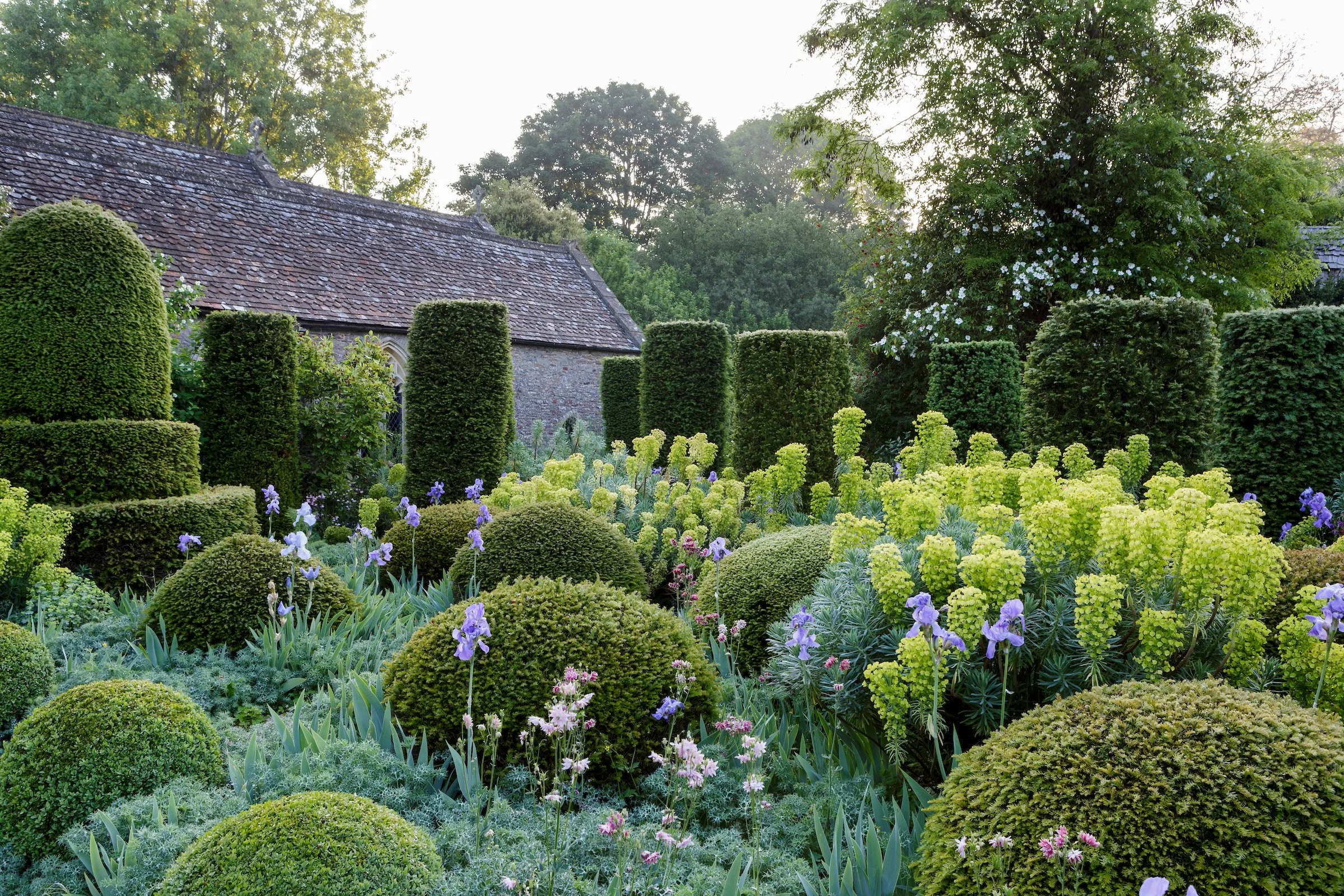 Our collection of roses include the blush pink Rosa ‘Great Maidens Bush’, deep red Rosa ‘Charles de Mills’ and bright pink Rosa ‘Madame Knorr’. All of which weave through and around the rich tapestry of box and yew topiary, and aged oak balustrades and obelisks, central to the Bannerman's design.